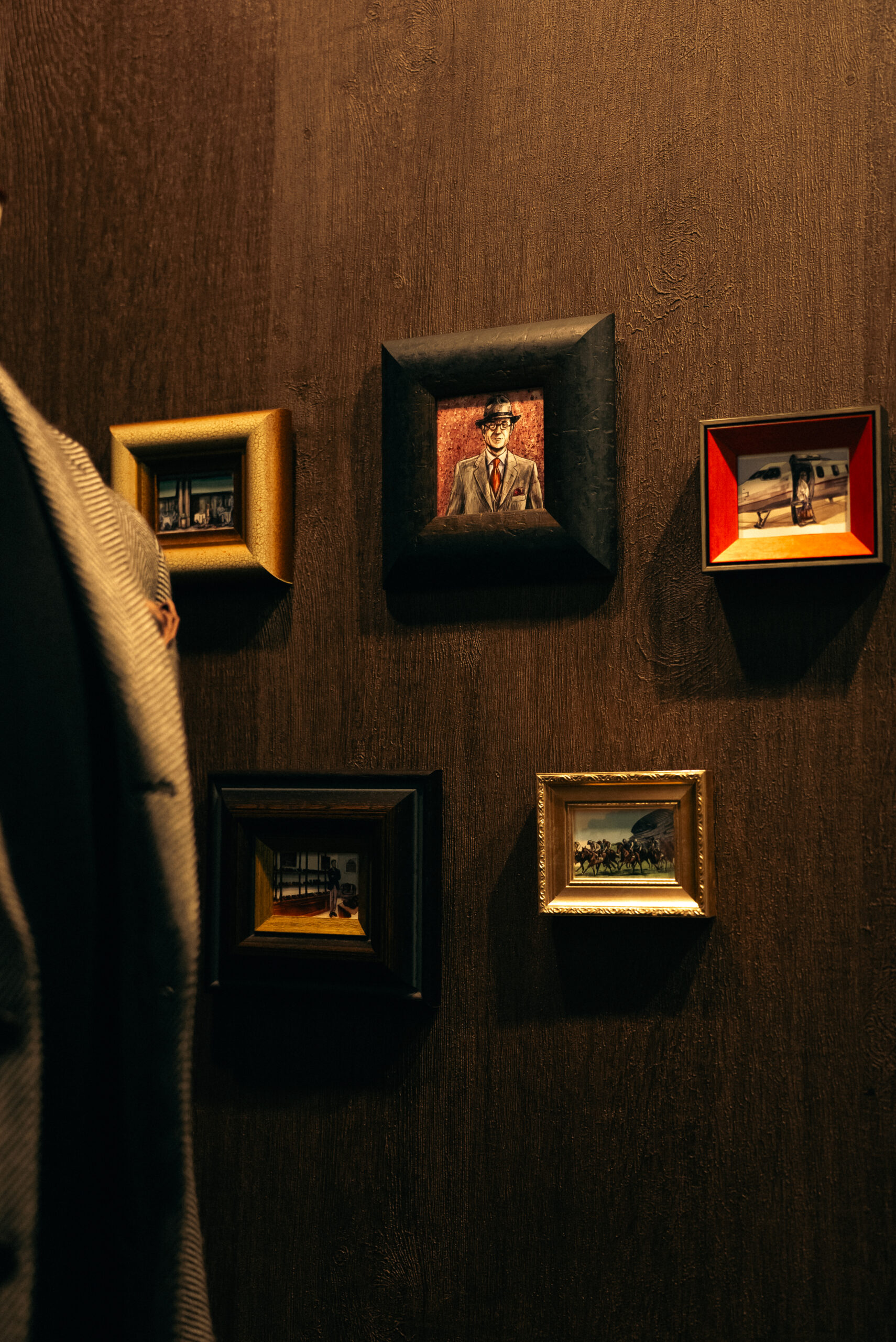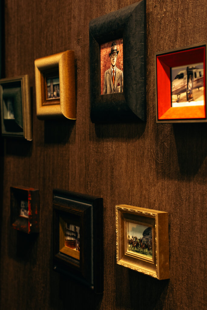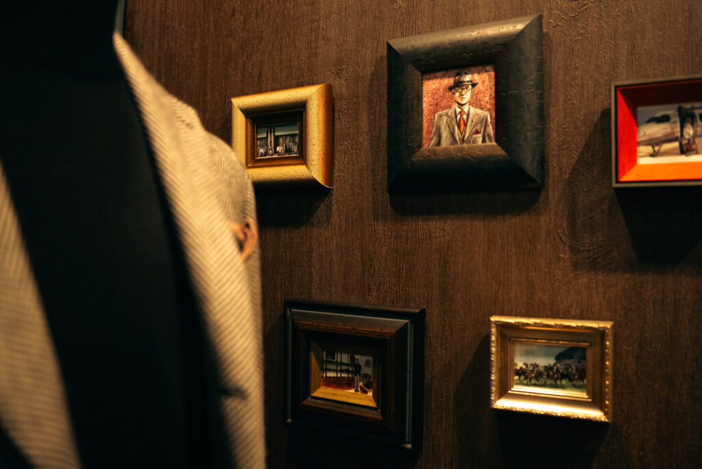 現在、オーダースーツが並ぶその傍らには、いくつもの小さな額縁が整然と飾られています。かつてこの場所は下駄箱として使われていましたが、私はここを「靴磨き職人の作業スペース」へと作り変えました。その瞬間に、カーテンと共にこの額縁たちを設置したのです。