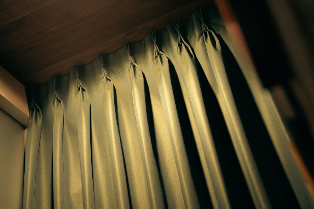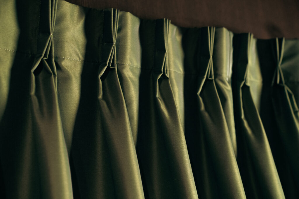 特にこだわったのは、上部の折り目である「タック」の数です。通常は二つ山が一般的ですが、AKILOUNGEではあえて「三つ山」を採用しました。このひと手間が生み出す深いドレープが、空間に重厚感とエレガンスをもたらすのです。